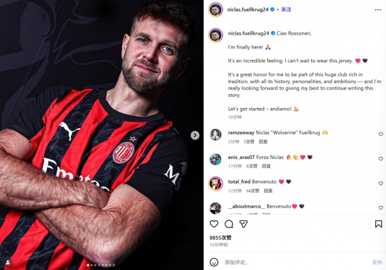 菲尔克鲁格表示:“嗨,罗森内里(红黑军团)!我终于来到这里了!🙏🏼这种感觉太棒了!我已经迫不及待地想穿上这件球衣了。❤️🖤”
